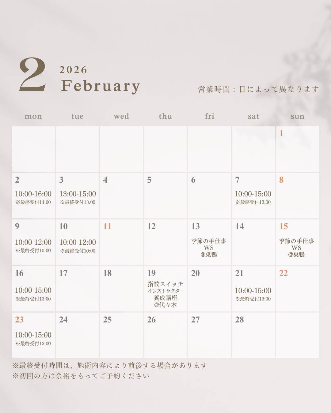 2月のご予約カレンダーを公開しました。